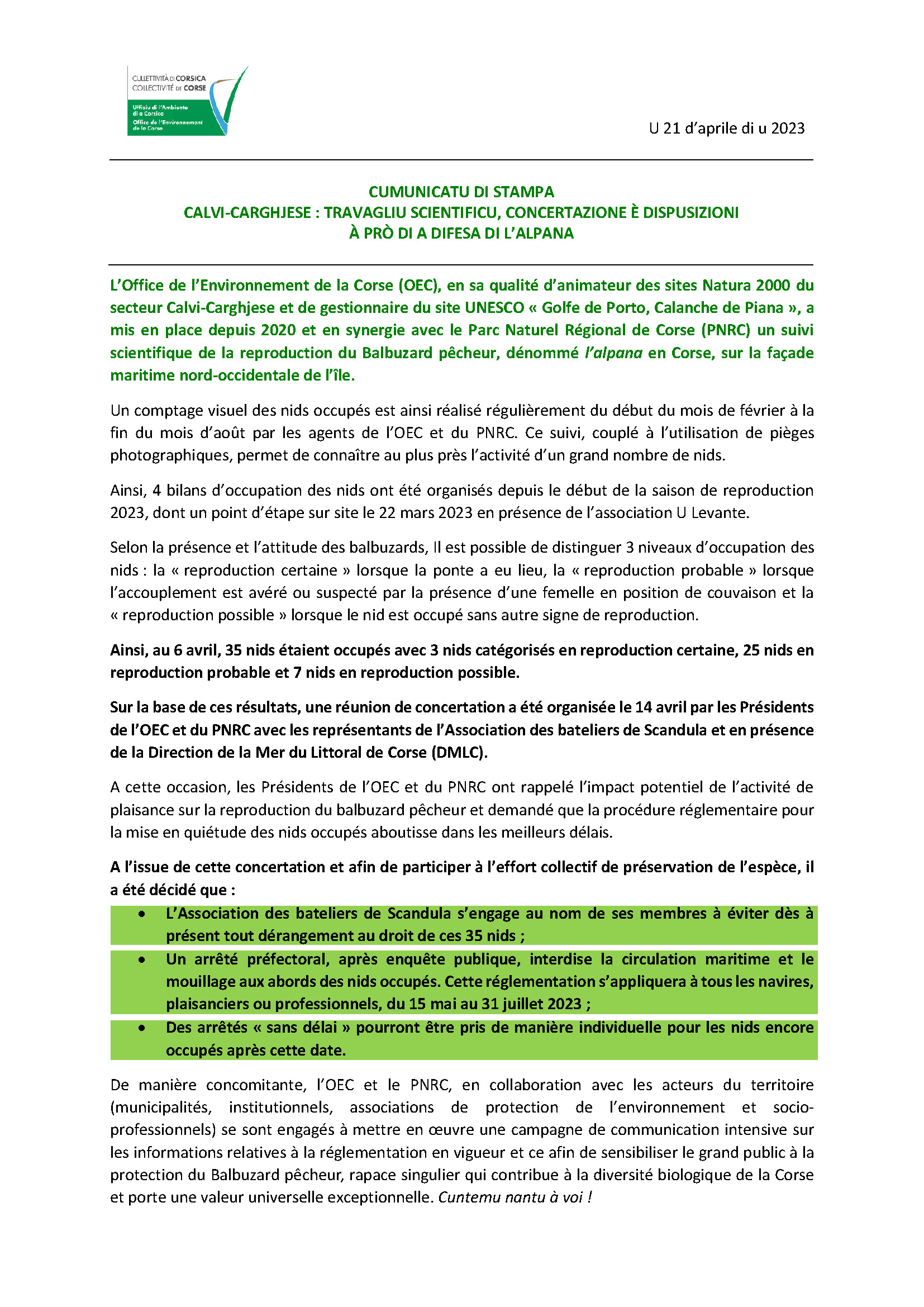L’OEC communique sur la concertation en cours et les mesures de protection fortes proposées pour la préservation des populations de Balbuzard pêcheur de la façade maritime nord-occidentale de l’île.