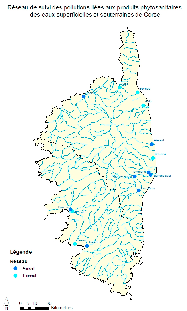 Les résultats obtenus ont montré la présence de ces produits dans les eaux superficielles, même dans les régions non agricoles (Prunelli). Face à ce constat, un réseau de suivi a été mis en place afin qu’un état des lieux soit réalisé concernant l’impact des produits phytosanitaires utilisés sur la région Corse. Pour mieux cibler les bassins versants à étudier, une étude statistique des pratiques agricoles existantes dans la région a été effectuée. Celle-ci a permis de démarquer plusieurs microrégions où la pression agricole est la plus importante.